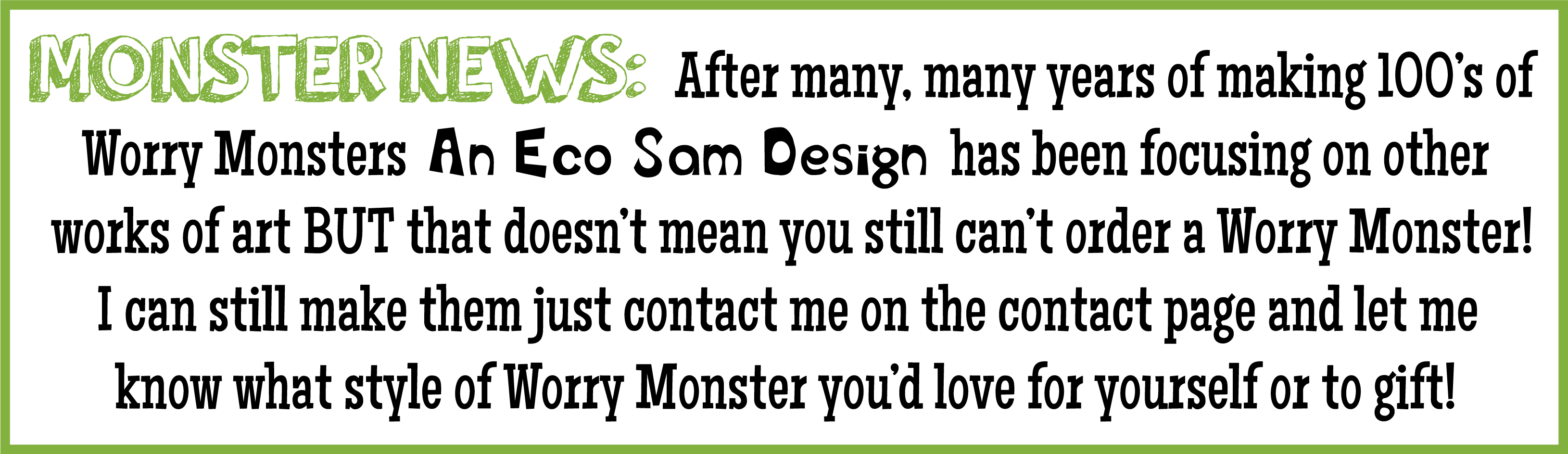 "Bob" - Meet "Bob". "Bob" is a Worry Monster that is a "trademark" of AnEcoSamDesign, LLC. and Worry Monsters - he is the only Monster is that made all the time and always looks the same. He is also the only Monster without hair, he is unique and fun and a favorite among all age groups. Once he becomes yours feel free to name him any name you choose. :) |